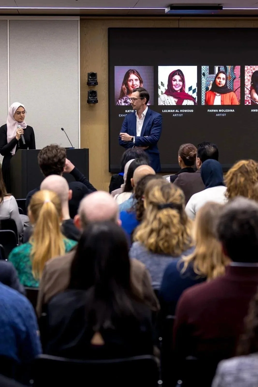 The exhibition spoke directly to Forward Thinking’s work in breaking down barriers and creating spaces for dialogue at a time of profound global uncertainty. The ways in which culture can serve as a bridge in times of crisis were felt acutely on the night. Lulwah Al Homoud’s work had arrived from Riyadh despite shipping delays caused by regional disruption, but she herself was unable to travel. Lulwah joined a Q&A panel with the artists via video link, a powerful illustration of how conflict constrains human connection, even as art continues to reach across divides.